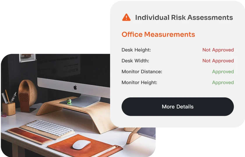 Employees complete a virtual ergonomic training and guided DSE self-assessment. This includes ergonomic, environmental, and equipment considerations - whether they’re working from home, in the office, or a bit of both. Behind the scenes, slick back-end software measures each employee’s environment and generates an automated risk assessment and personalized recommendations. Your team gets a centralized record of individual responses, automated risk assessments, required follow-up actions and end-to-end compliance documentation - all in one place.